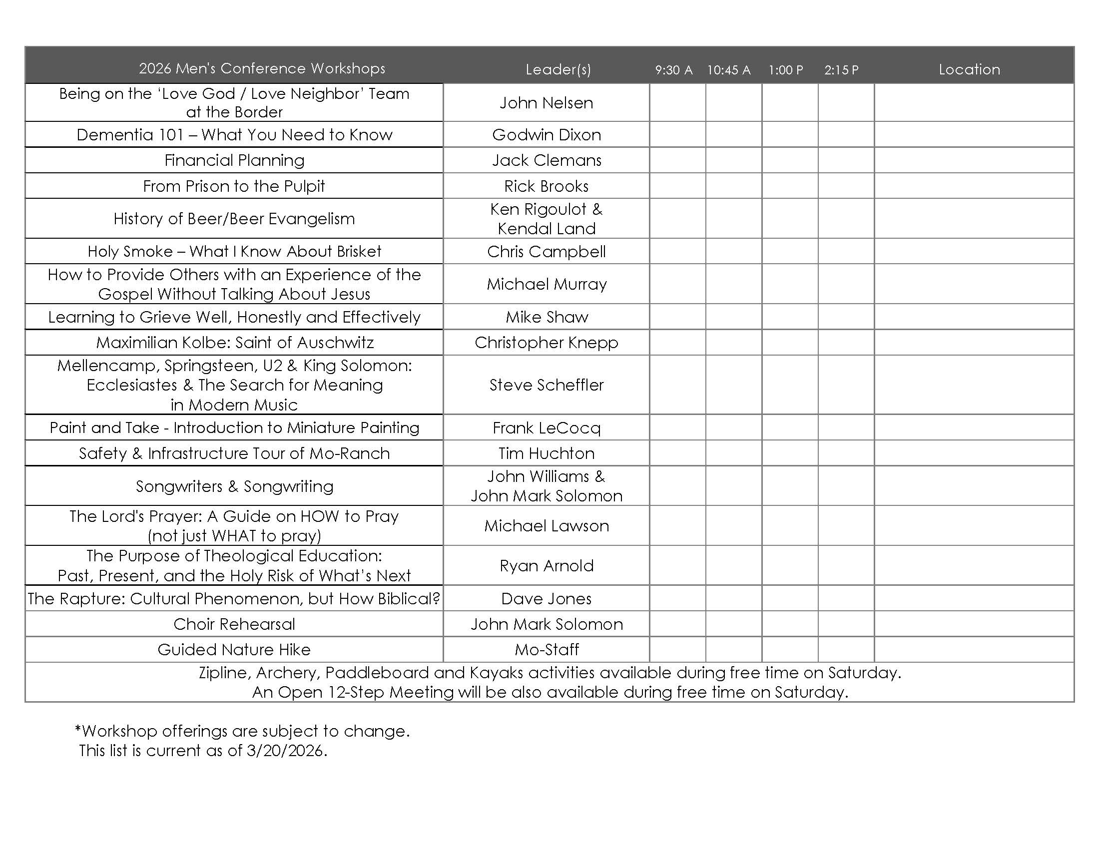 - Create an atmosphere for each man to have a joyful weekend at the conference.